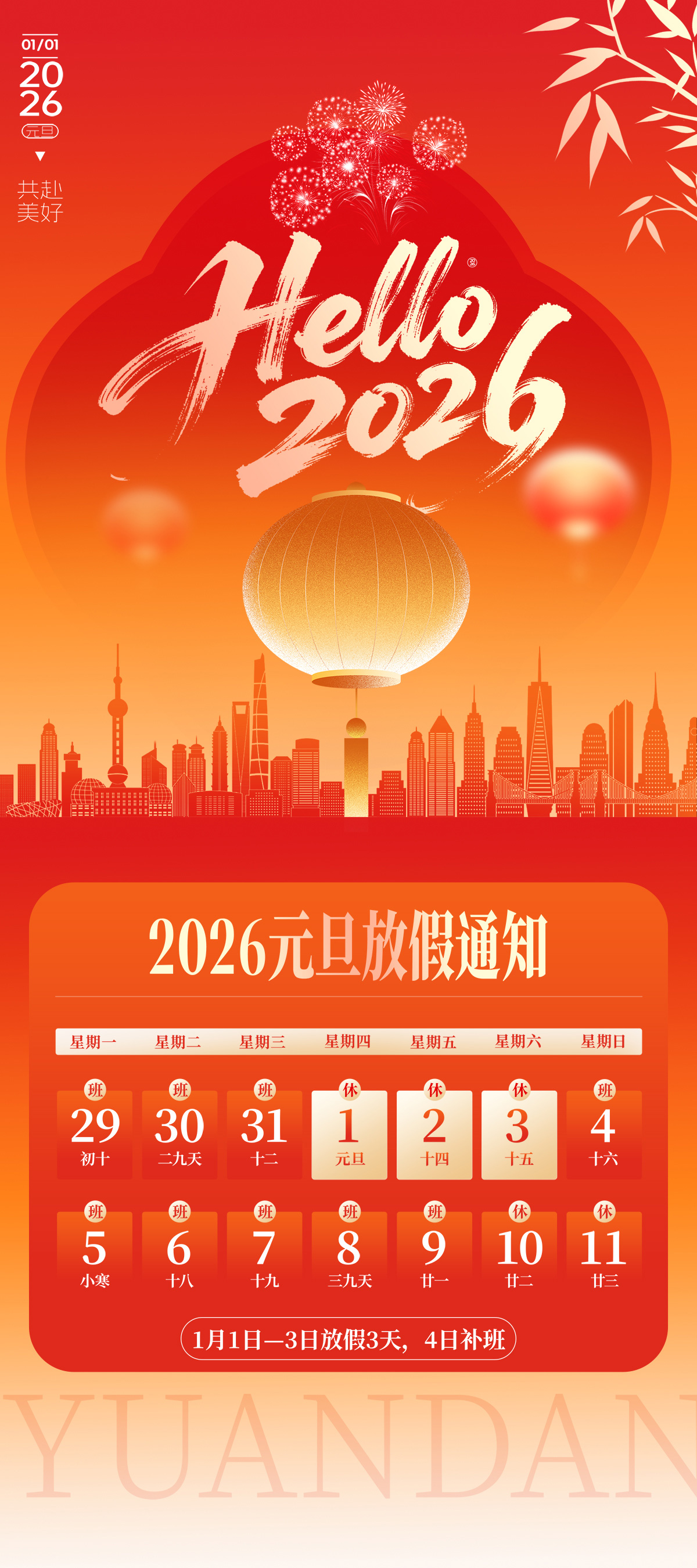 2026年元旦假期共计3天,具体时间为2026年1月1日(星期四)至2026年1月3日(星期六)。1月4日(星期日)正常上班,请大家提前做好工作安排与生活规划,确保节后能够迅速投入到紧张有序的工作当中。